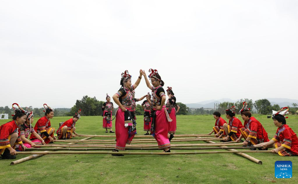 Local residents perform traditional bamboo dance in Pushan Village of Longyou County, east China's Zhejiang Province, May 24, 2023. Pushan Village has donned a new look with improved public infrastructure and colorful decoration in the past years. Entertainment facilities and homestay businesses have also been developed to boost tourism and increase local villagers' income, injecting momentum and vitality into rural revitalization. (Xinhua/Du Xiaoyi)