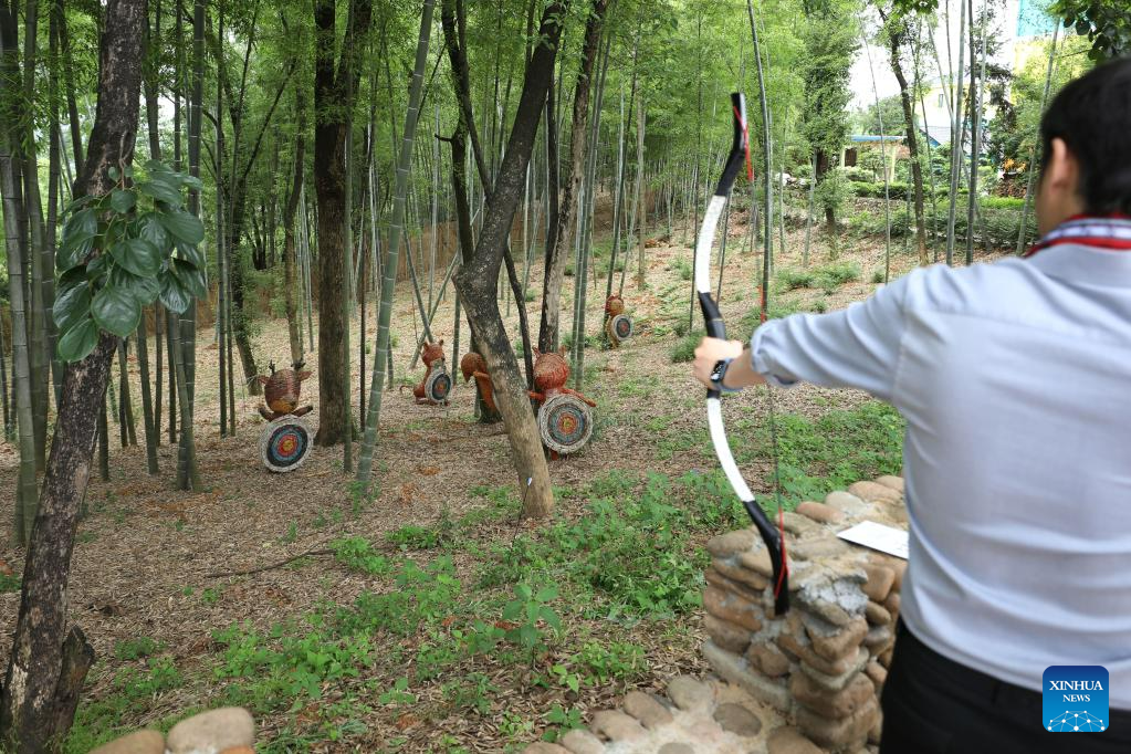 A tourist tries archery in Pushan Village of Longyou County, east China's Zhejiang Province, May 24, 2023. Pushan Village has donned a new look with improved public infrastructure and colorful decoration in the past years. Entertainment facilities and homestay businesses have also been developed to boost tourism and increase local villagers' income, injecting momentum and vitality into rural revitalization. (Xinhua/Du Xiaoyi)