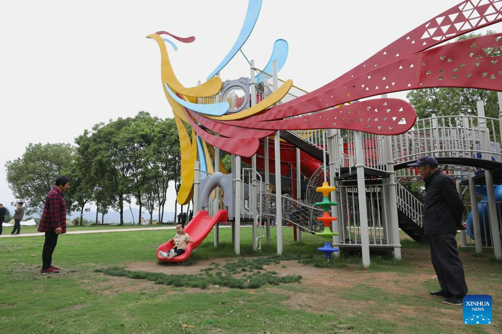 A child plays on the slide in Pushan Village of Longyou County, east China's Zhejiang Province, May 24, 2023. Pushan Village has donned a new look with improved public infrastructure and colorful decoration in the past years. Entertainment facilities and homestay businesses have also been developed to boost tourism and increase local villagers' income, injecting momentum and vitality into rural revitalization. (Xinhua/Du Xiaoyi)
