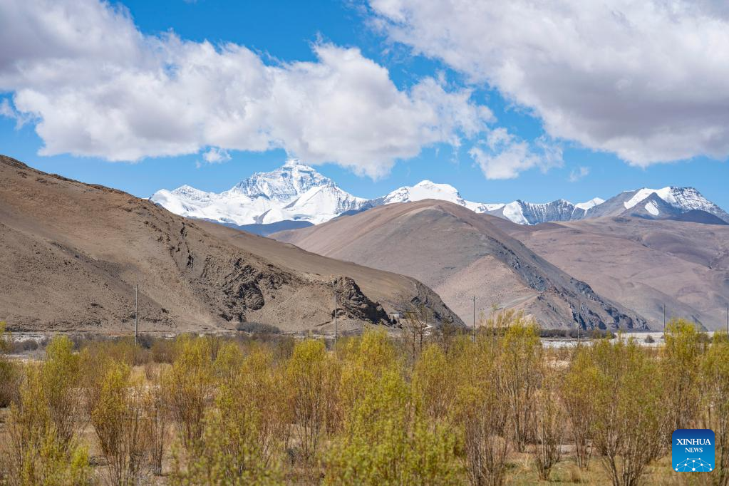 This photo taken on May 25, 2023 shows trees at the foot of Mount Qomolangma in southwest China's Tibet Autonomous Region.?(Xinhua/Sun Fei)