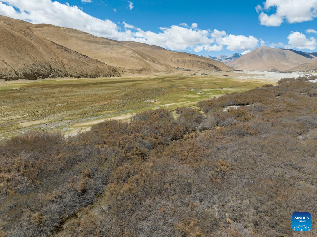 This aerial photo taken on May 25, 2023 shows a seabuckthorn forest and wetlands in Qomolangma National Nature Reserve, southwest China's Tibet Autonomous Region. (Xinhua/Sun Fei)