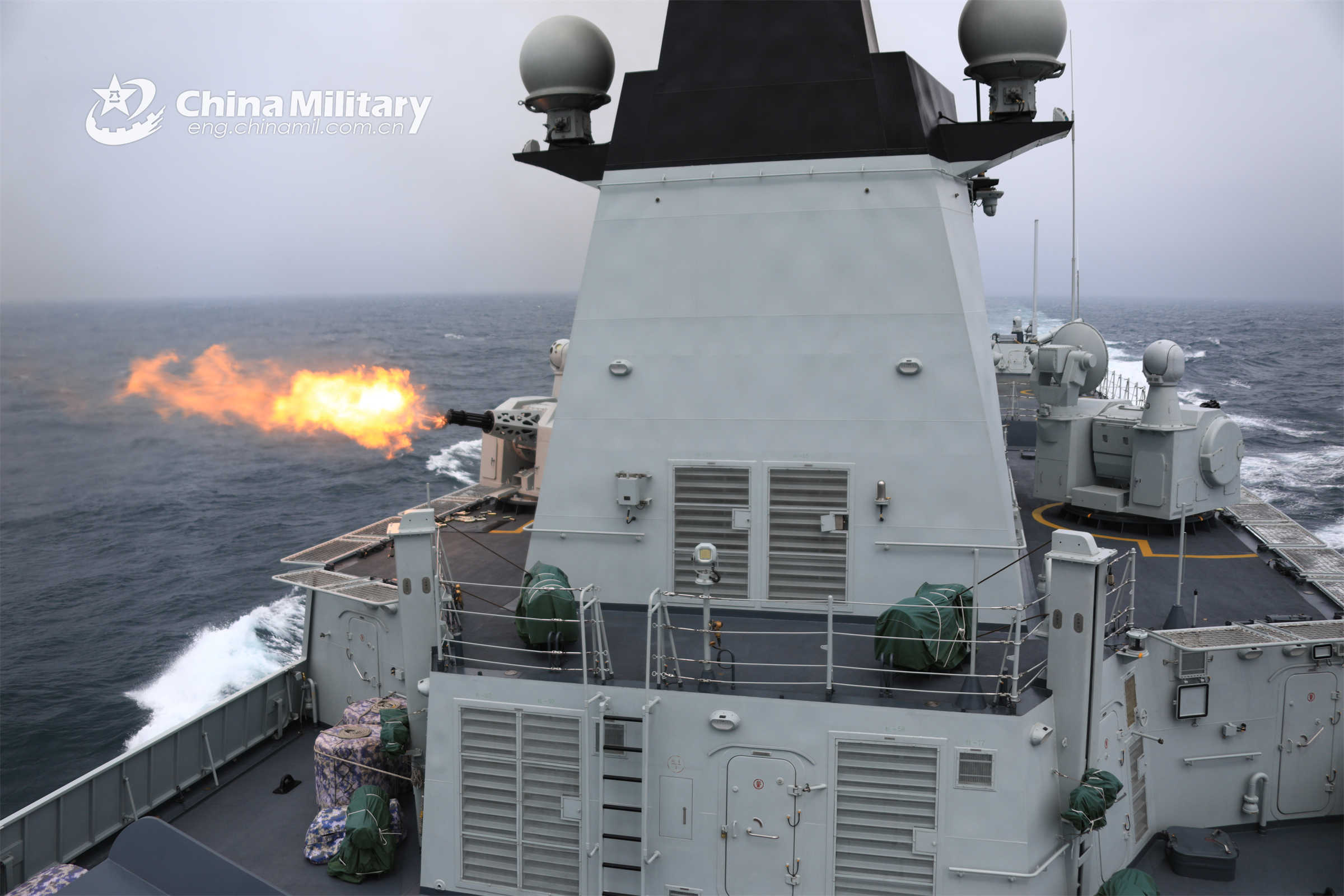 Type-054A guided missile frigate Bayannaoer (Hull 551) attached to a naval frigate flotilla under the PLA Southern Theater Command fires its secondary gun at mock sea targets during a joint maritime drill on May 7, 2023. The four-day joint drill focused on subjects of weapon handling, damage control, warship maneuver in formation, etc., in a bid to improve the troops' quick response and coordination capabilities. (eng.chinamil.com.cn/Photo by Cai Shengqiu)
