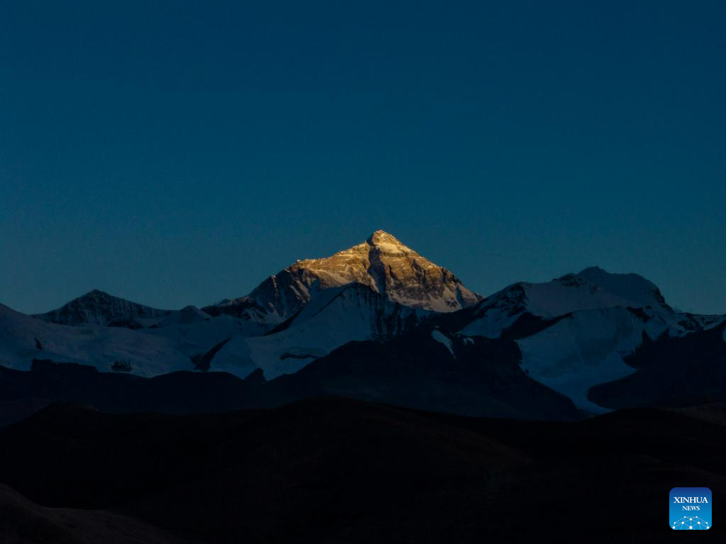 This photo taken on May 11, 2023 shows a view of Mount Qomolangma in the sunset in southwest China's Tibet Autonomous Region. (Xinhua/Sun Fei)