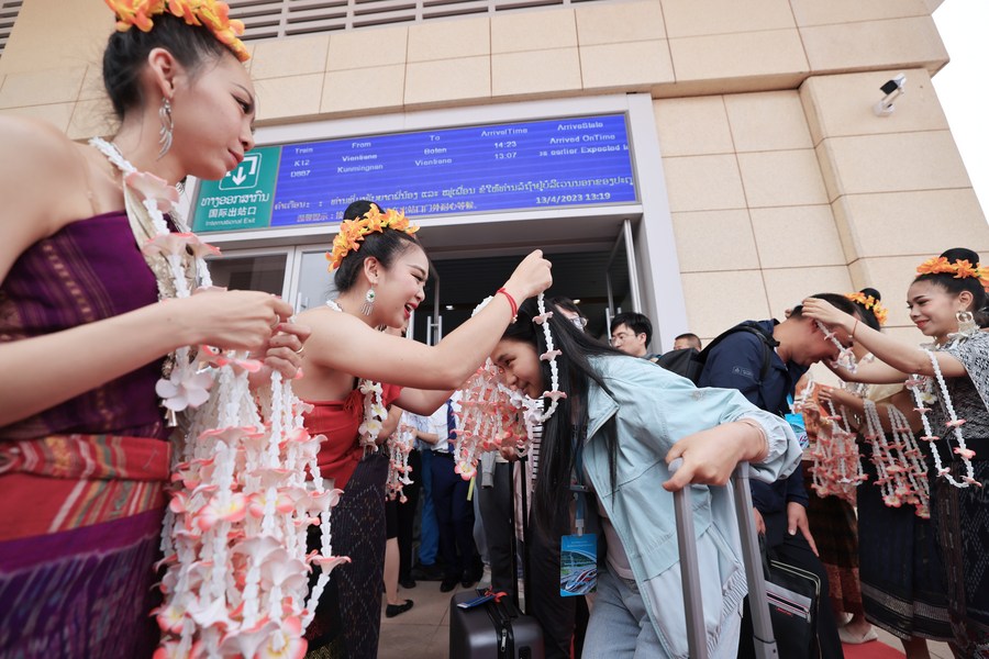 The China-Laos railway started cross-border passenger services between the Lao capital Vientiane and Kunming, the capital city of southwest China's Yunnan province, on April 13. The first group of Chinese tourists, numbering more than 200 in total, arrived in Laos after traveling on the first cross-border train.