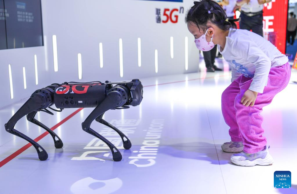 A child interacts with a robotic dog at the China International Big Data Industry Expo 2023 in Guiyang, capital of southwest China's Guizhou Province, May 26, 2023. The China International Big Data Industry Expo 2023 kicked off on Friday in Guiyang, showcasing the country's latest achievements in the big data industry and promoting relevant business exchanges. (Xinhua/Yang Wenbin)