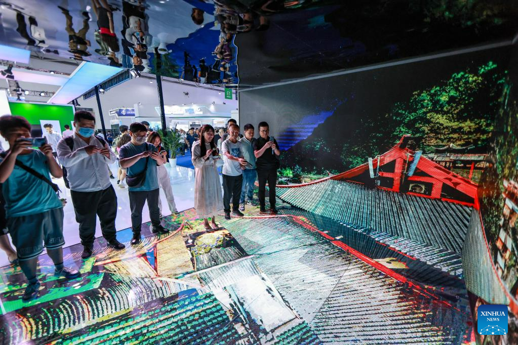 Visitors watch videos produced by cloud computing technology at the China International Big Data Industry Expo 2023 in Guiyang, southwest China's Guizhou Province, May 26, 2023. The China International Big Data Industry Expo 2023 kicked off on Friday in Guiyang, showcasing the country's latest achievements in the big data industry and promoting relevant business exchanges. (Xinhua/Ou Dongqu)