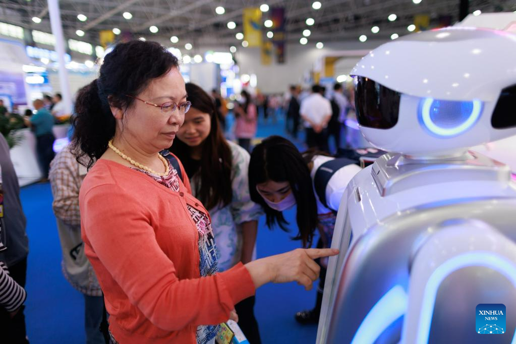 Visitors experience a smart robot at the China International Big Data Industry Expo 2023 in Guiyang, capital of southwest China's Guizhou Province, May 26, 2023. The China International Big Data Industry Expo 2023 kicked off on Friday in Guiyang, showcasing the country's latest achievements in the big data industry and promoting relevant business exchanges. (Xinhua/Liu Xu)