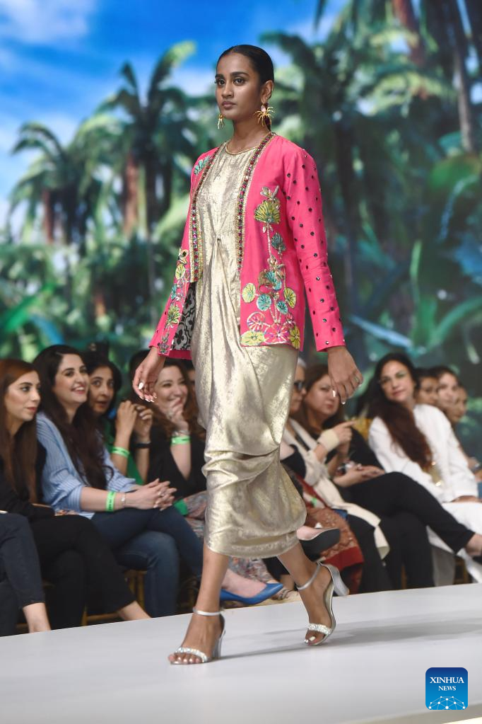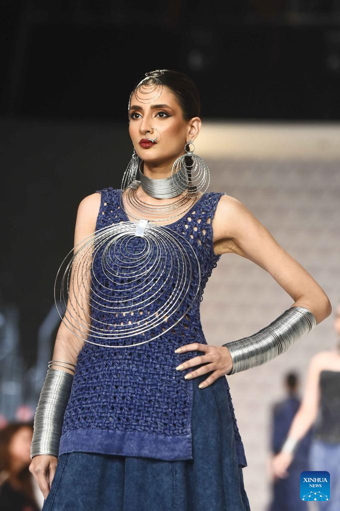 A model presents a creation during a fashion show organized by the Trade Development Authority of Pakistan (TDAP) in Karachi, Pakistan, on May 26, 2023. (Str/Xinhua)