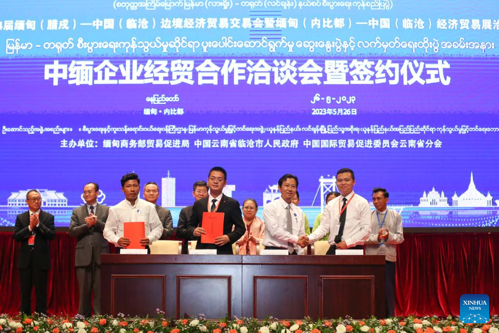 Representatives from Myanmar and China attend a signing ceremony of business agreements during a forum on Myanmar-China trade cooperation in Nay Pyi Taw, Myanmar, on May 26, 2023. (Photo by Myo Kyaw Soe/Xinhua)