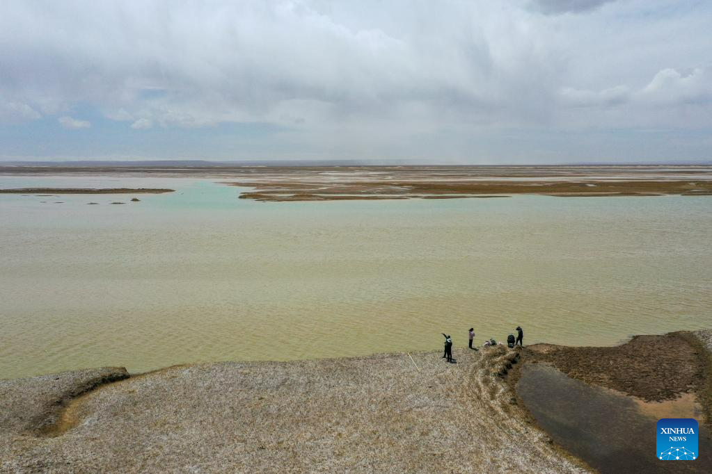 Researchers collect water samples in the Kumkol Basin in the east of the Kunlun Mountains, northwest China's Xinjiang Uygur Autonomous Region, May 23, 2023. Recently, researchers from the Xinjiang Institute of Ecology and Geography under the Chinese Academy of Sciences have launched a scientific expedition to investigate water resources on the northern slope of the Kunlun Mountains. (Xinhua/Ding Lei)