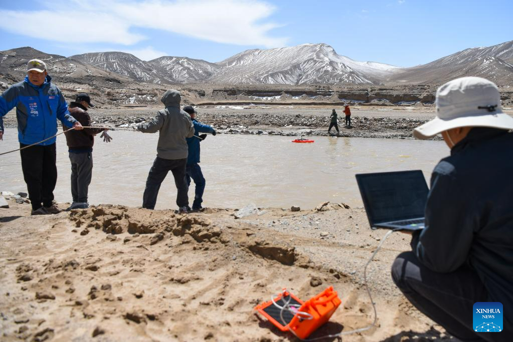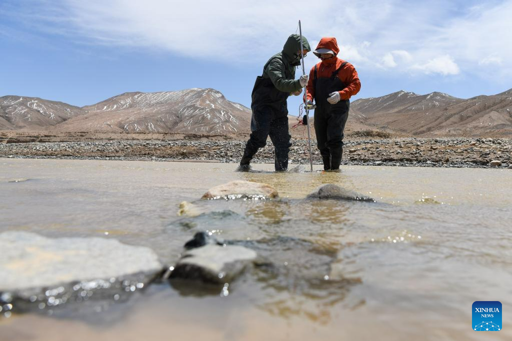 Researchers test the river velocity and discharge in the Kumkol Basin in the east of the Kunlun Mountains, northwest China's Xinjiang Uygur Autonomous Region, May 22, 2023. Recently, researchers from the Xinjiang Institute of Ecology and Geography under the Chinese Academy of Sciences have launched a scientific expedition to investigate water resources on the northern slope of the Kunlun Mountains. (Xinhua/Ding Lei)