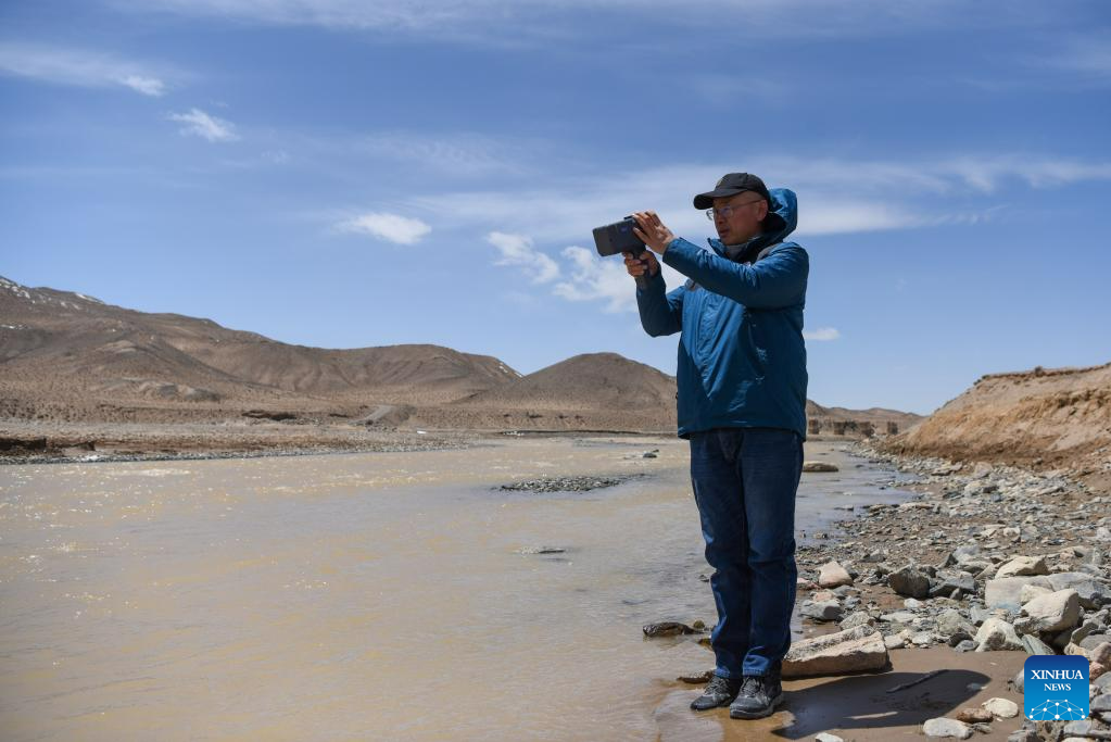 A researcher tests the river velocity in the Kumkol Basin in the east of the Kunlun Mountains, northwest China's Xinjiang Uygur Autonomous Region, May 22, 2023. Recently, researchers from the Xinjiang Institute of Ecology and Geography under the Chinese Academy of Sciences have launched a scientific expedition to investigate water resources on the northern slope of the Kunlun Mountains. (Xinhua/Ding Lei)