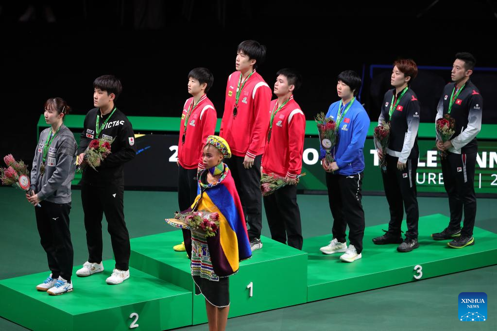 First-placed Wang Chuqin (4th L)/Sun Yingsha (3rd L) of China, second-placed Harimoto Tomokazu (2nd L)/Hayata Hina (1st L) of Japan and third-placed Lin Shidong (4th R)/Kuai Man (3rd R) of China and Wong Chun Ting (1st R)/Doo Hoi Kem of China's Hong Kong attend the mixed doubles awarding ceremony at 2023 ITTF Table Tennis World Championships Finals in Durban, South Africa, May 26, 2023. (Xinhua/Wang Dongzhen)