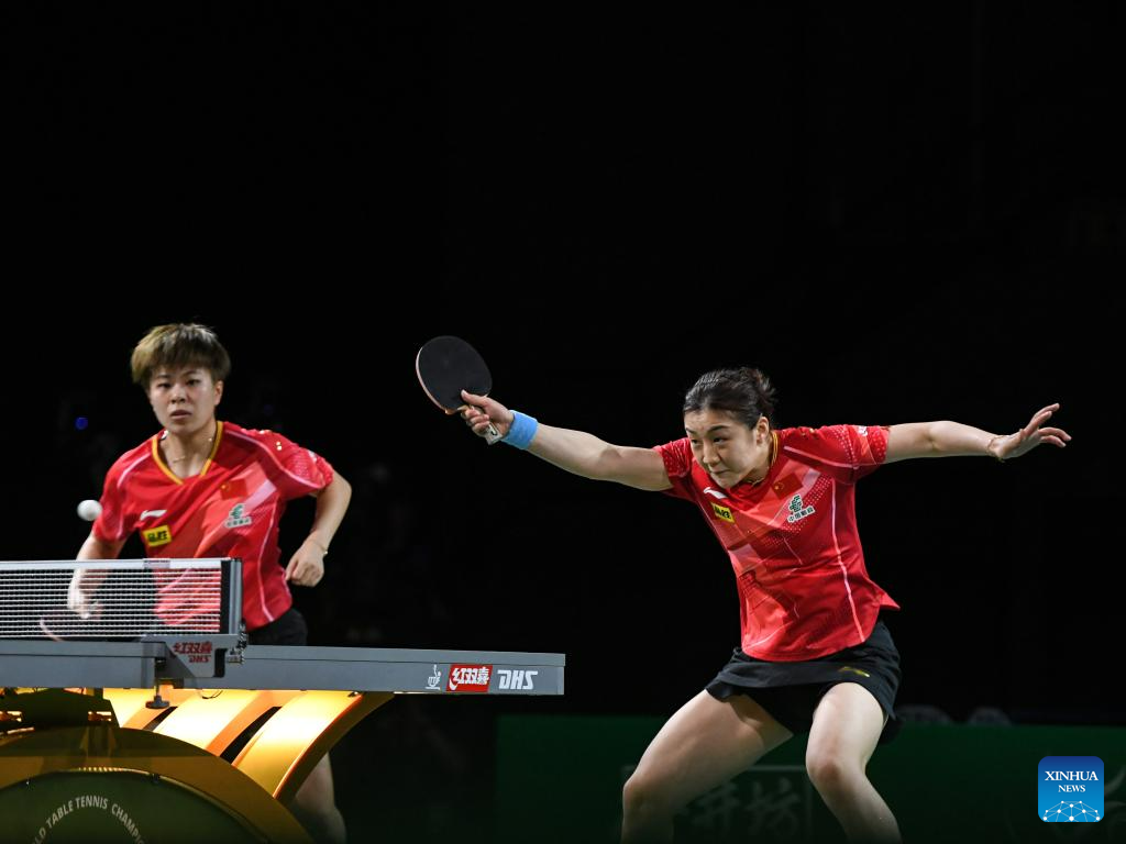 Chen Meng(R)/Wang Yidi of China compete during the women's doubles semifinal against Kihara Miyuu /Nagasaki Miyu of Japan at 2023 ITTF Table Tennis World Championships Finals in Durban, South Africa, May 26, 2023. (Xinhua/Li Yahui)