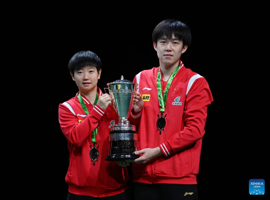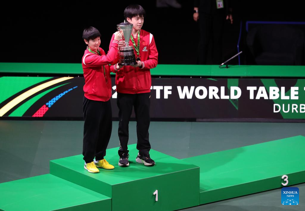 First-placed Wang Chuqin (R)/Sun Yingsha of China pose with the trohpy during the mixed doubles awarding ceremony at 2023 ITTF Table Tennis World Championships Finals in Durban, South Africa, May 26, 2023. (Xinhua/Tao Xiyi)