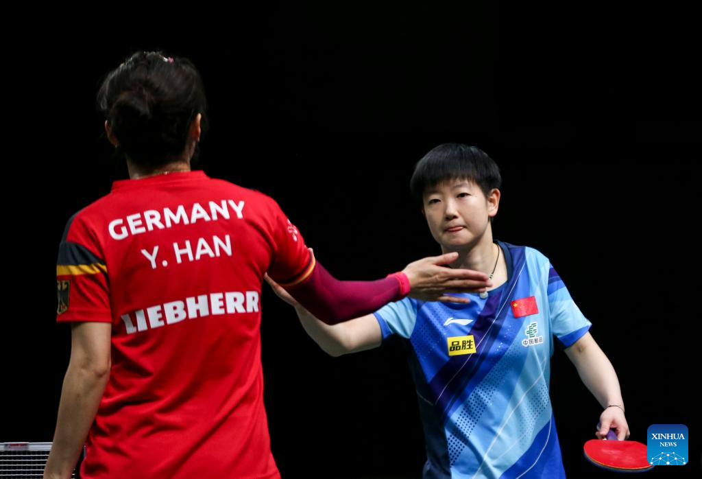 Sun Yingsha (R) of China shakes hands with Han Ying of Germany after their women's singles quarterfinal at 2023 ITTF Table Tennis World Championships Finals in Durban, South Africa, May 26, 2023. (Xinhua/Zhang Yudong)