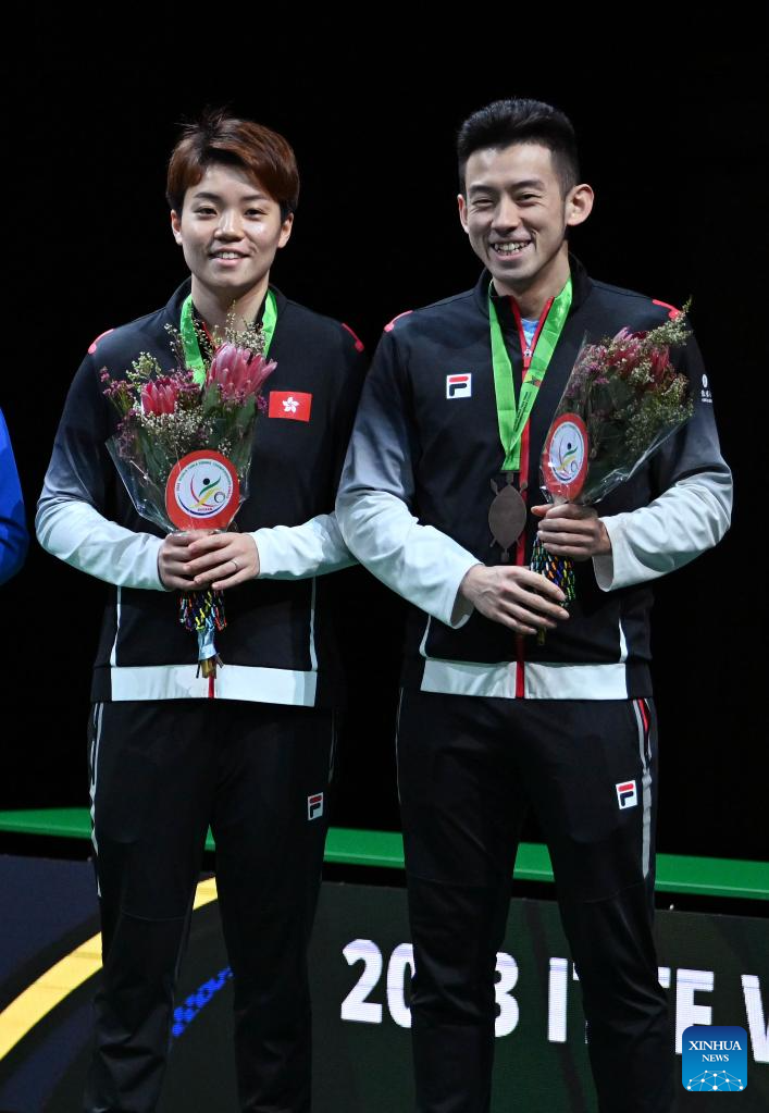 Third-placed Wong Chun Ting (R)/Doo Hoi Kem of China's Hong Kong pose during the mixed doubles awarding ceremony at 2023 ITTF Table Tennis World Championships Finals in Durban, South Africa, May 26, 2023. (Xinhua/Tao Xiyi)