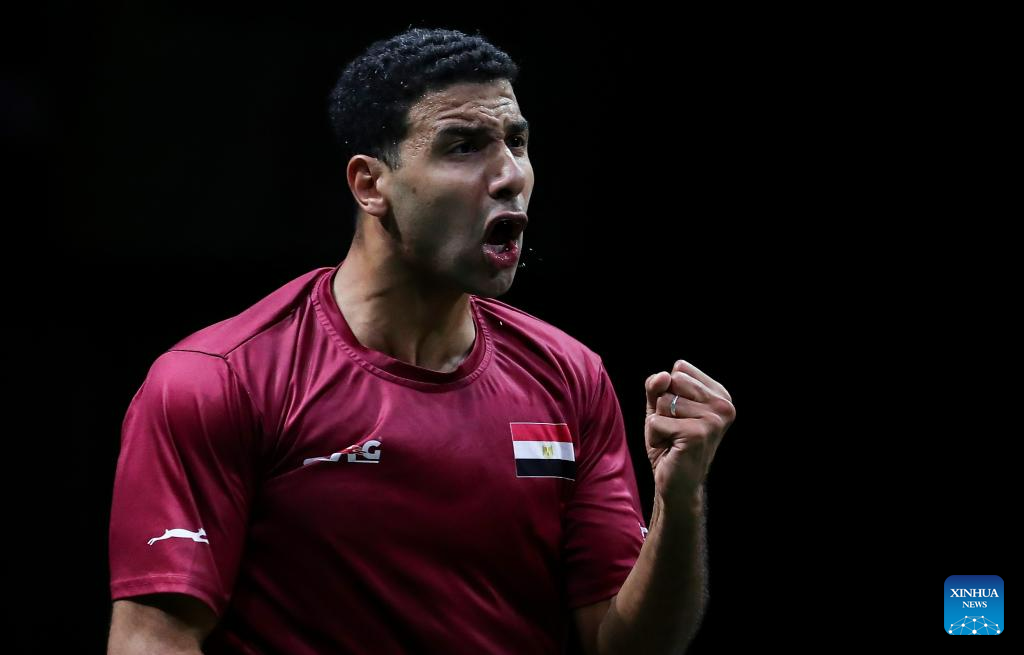 Omar Assar of Egypt celebrates during the men's singles quarterfinal against Fan Zhendong of China at 2023 ITTF Table Tennis World Championships Finals in Durban, South Africa, May 26, 2023. (Xinhua/Wang Dongzhen)