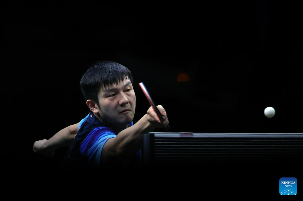 Fan Zhendong of China hits a return during the men's singles quarterfinal against Omar Assar of Egypt at 2023 ITTF Table Tennis World Championships Finals in Durban, South Africa, May 26, 2023. (Xinhua/Wang Dongzhen)