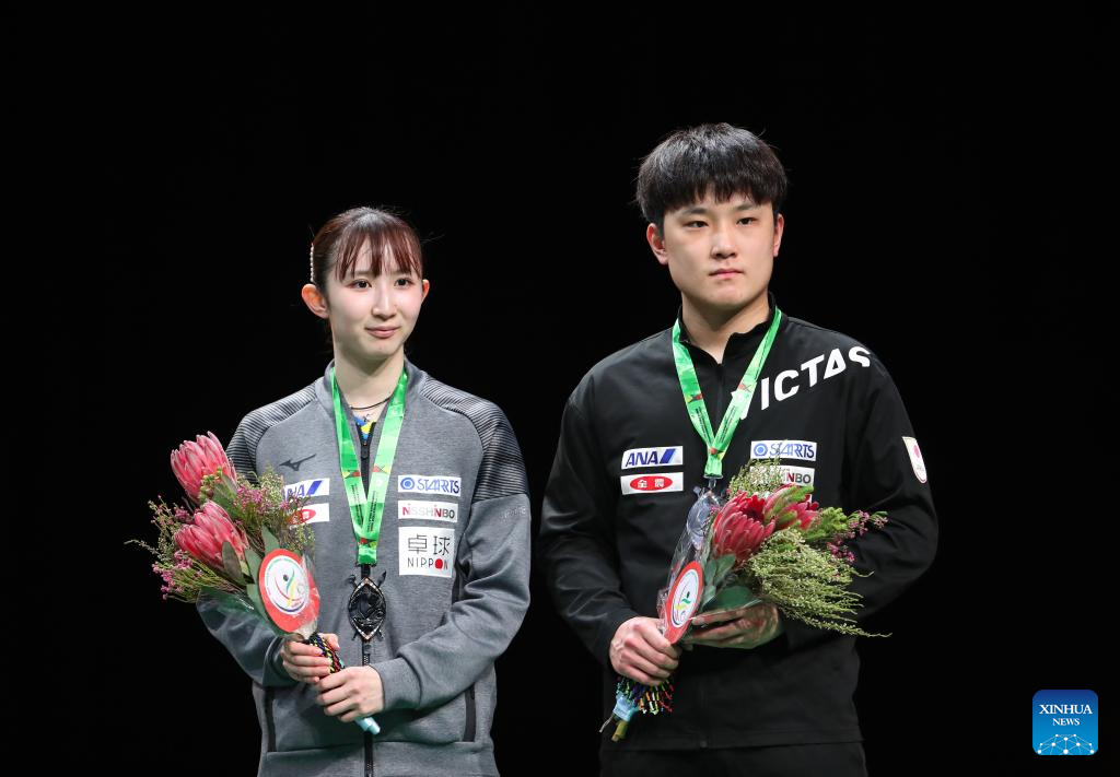 Second-placed Harimoto Tomokazu (R)/Hayata Hina of Japan attend the mixed doubles awarding ceremony at 2023 ITTF Table Tennis World Championships Finals in Durban, South Africa, May 26, 2023. (Xinhua/Han Xu)