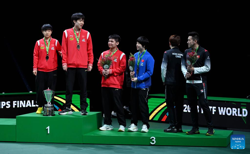 Third-placed Lin Shidong (1st L)/Kuai Man (2nd L) of China and Wong Chun Ting (1st R)/Doo Hoi Kem of China's Hong Kong pose during the mixed doubles awarding ceremony at 2023 ITTF Table Tennis World Championships Finals in Durban, South Africa, May 26, 2023. (Xinhua/Han Xu)