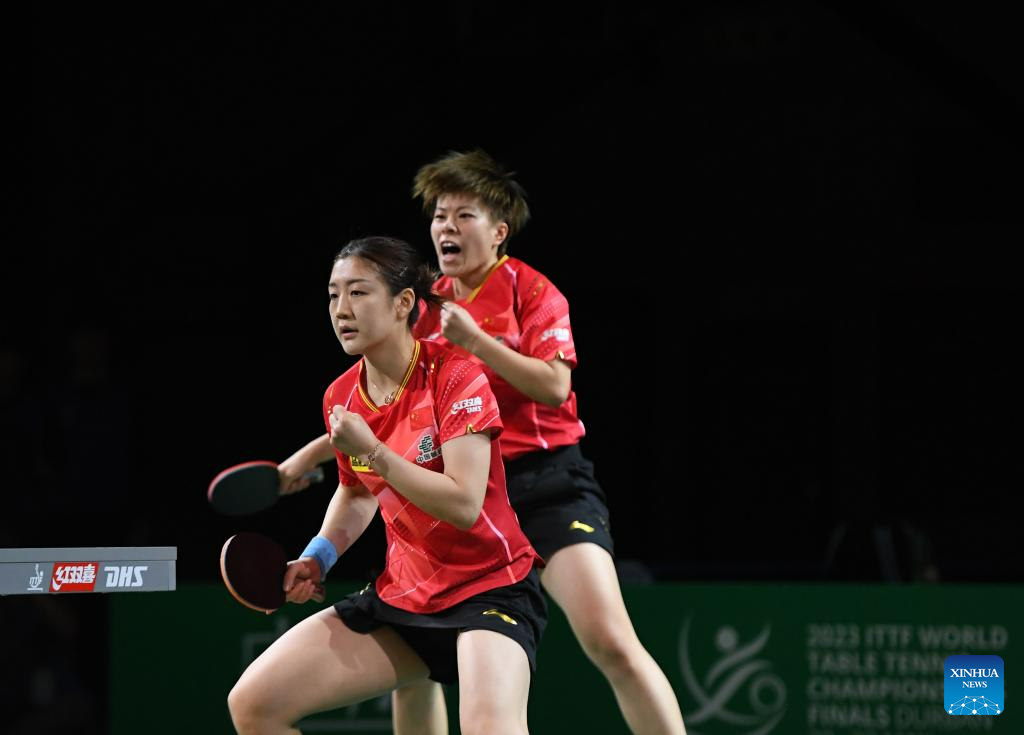 Chen Meng/Wang Yidi (L) of China celebrate during the women's doubles semifinal against Kihara Miyuu /Nagasaki Miyu of Japan at 2023 ITTF Table Tennis World Championships Finals in Durban, South Africa, May 26, 2023. (Xinhua/Li Yahui)