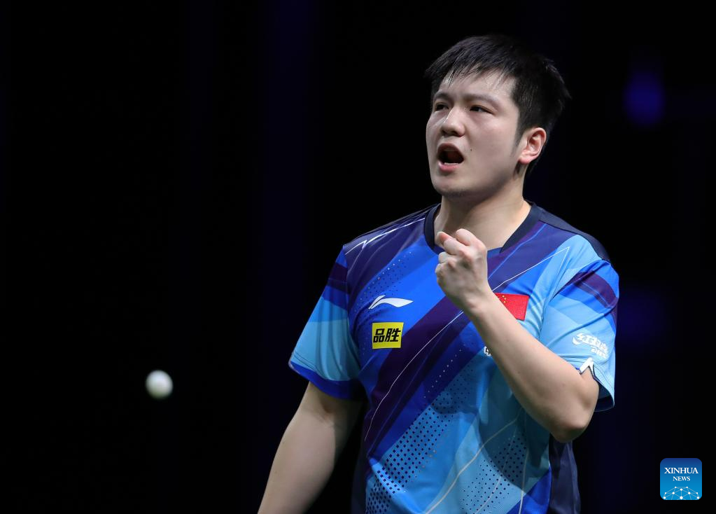 Fan Zhendong of China celebrates during the men's singles quarterfinal against Omar Assar of Egypt at 2023 ITTF Table Tennis World Championships Finals in Durban, South Africa, May 26, 2023. (Xinhua/Wang Dongzhen)