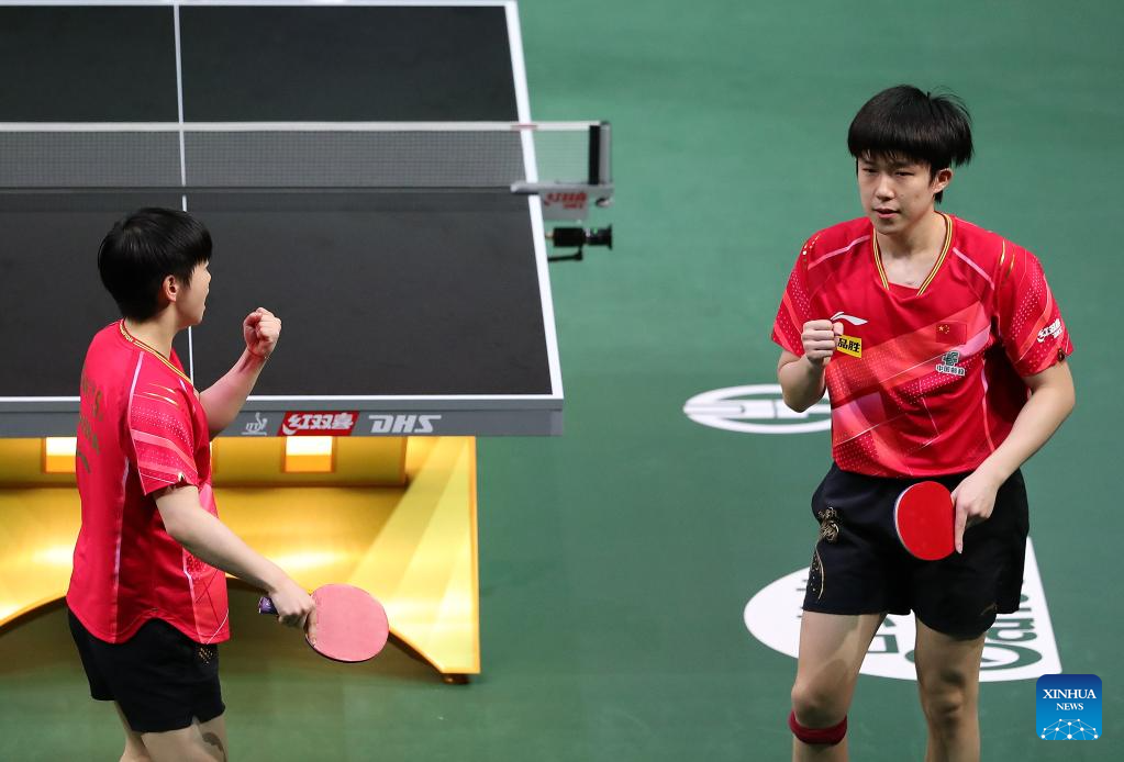 Wang Chuqin/Sun Yingsha (R) of China celebrate after winning the mixed doubles final match against Harimoto Tomokazu/Hayata Hina of Japan at 2023 ITTF Table Tennis World Championships Finals in Durban, South Africa, May 26, 2023. (Xinhua/Li Yahui)
