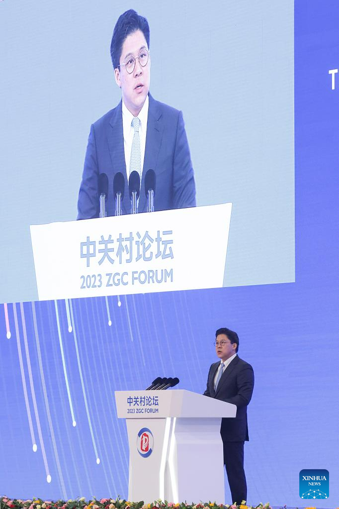 Kenneth Fok Kai-kong, vice chairman of All-China Youth Federation and president of the Asian Electronic Sports Federation, speaks during the plenary meeting of the 2023 Zhongguancun Forum (ZGC Forum) in Beijing, capital of China, May 26, 2023. Themed "Open Cooperation for a Shared Future," the 2023 Zhongguancun Forum held a plenary meeting here on Friday. (Xinhua/Zhang Yuwei)