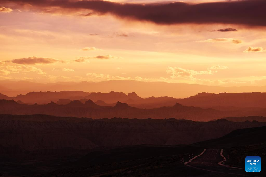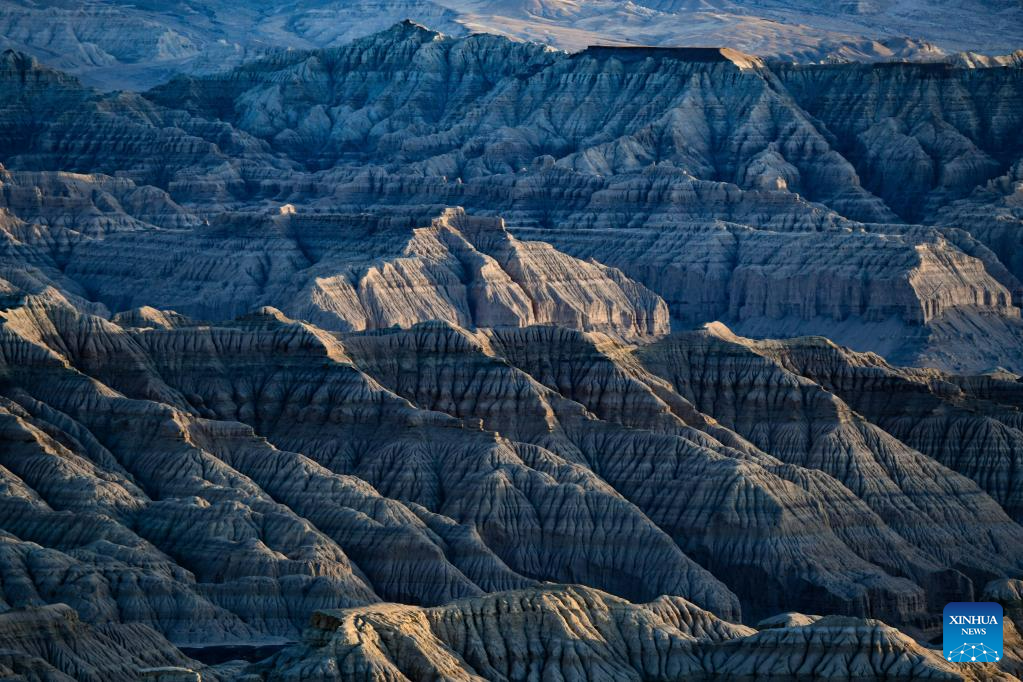 This photo taken on May 25, 2023 shows the landscape of earth forest at sunset in Zanda County, southwest China's Tibet Autonomous Region. Zanda is famous for the unique landscape of earth forest, which was formed by geological movement and soil erosion. These "forests" look yellowish, but the color varies in different parts. (Xinhua/Fei Maohua)