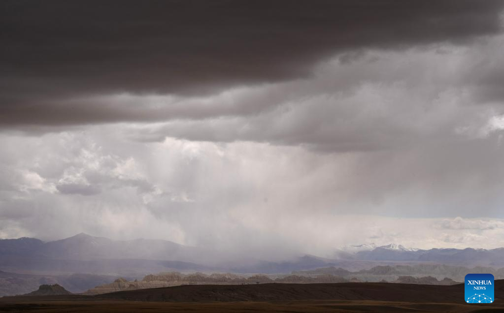 This photo taken on May 25, 2023 shows the rainy landscape of earth forest in Zanda County, southwest China's Tibet Autonomous Region. Zanda is famous for the unique landscape of earth forest, which was formed by geological movement and soil erosion. These "forests" look yellowish, but the color varies in different parts. (Xinhua/Fei Maohua)