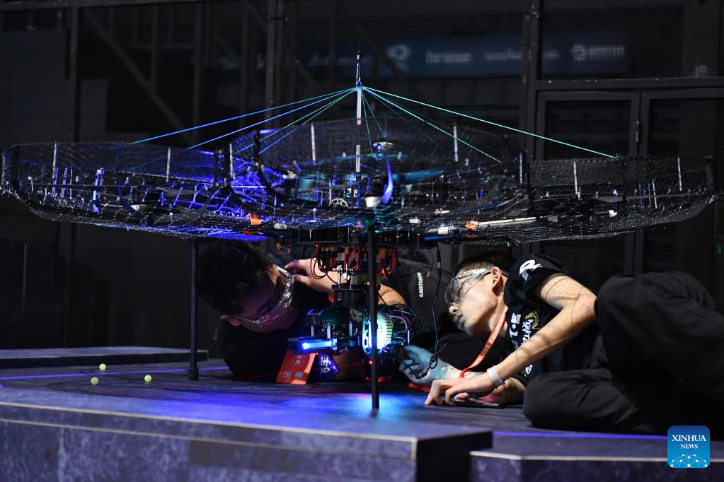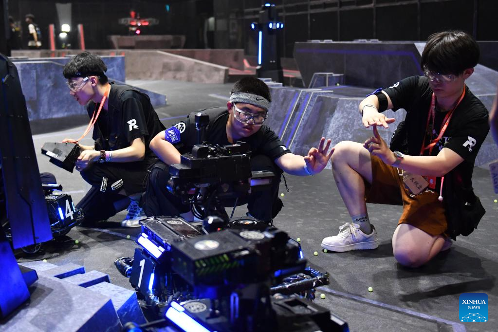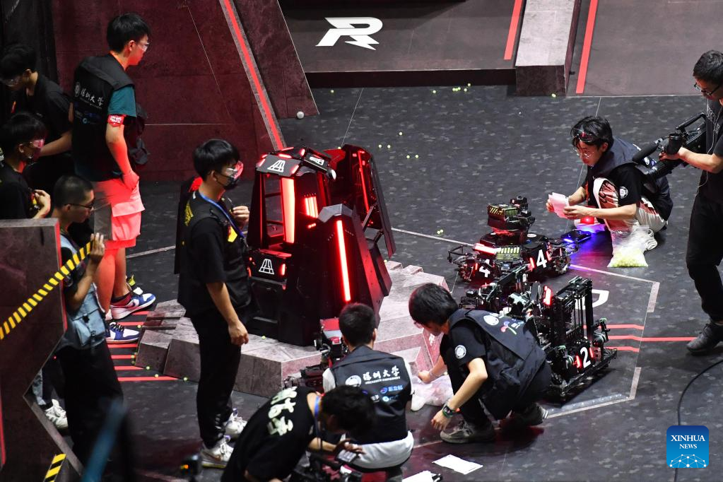 Contestants of team TOE from Dalian Jiaotong University test their robots during the RoboMaster 2023 University Championship Regional Competition (South China) in Changsha, central China's Hunan Province, May 28, 2023. The four-day regional competition concluded in Changsha on Sunday, with team RobotPilots from Shenzhen University winning the first place and team TOE from Dalian Jiaotong University being the second. (Xinhua/Chen Zhenhai)