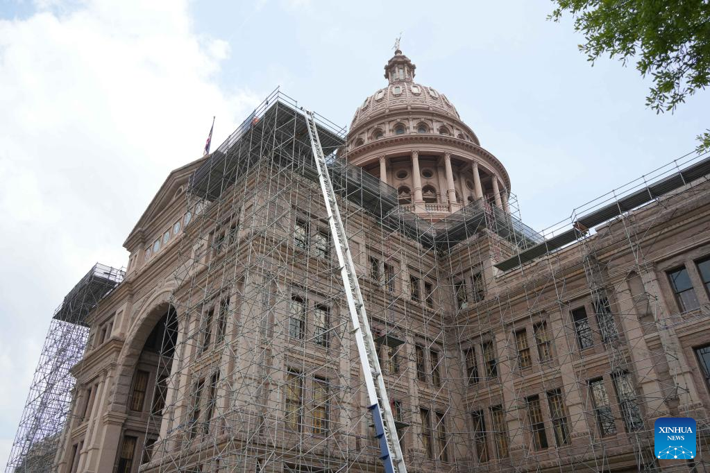 This photo taken on May 27,2023 shows the Texas Capitol which is under maintenance in Austin, Texas, the United States. The GOP-led Texas House of Representatives on Saturday voted to impeach Attorney General Ken Paxton, a powerful Republican and firm ally of former President Donald Trump in the second largest U.S. state, over yearslong accusations of corruption, lawbreaking and power-abusing. (Photo by Bo Lee/Xinhua)