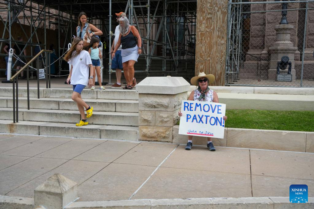 A protestor holds a sign that reads "Remove Paxton! Unfit for Office" in front of the Taxas Capitol building in Austin, Texas, the United States, May 27, 2023. The GOP-led Texas House of Representatives on Saturday voted to impeach Attorney General Ken Paxton, a powerful Republican and firm ally of former President Donald Trump in the second largest U.S. state, over yearslong accusations of corruption, lawbreaking and power-abusing. (Photo by Bo Lee/Xinhua)
