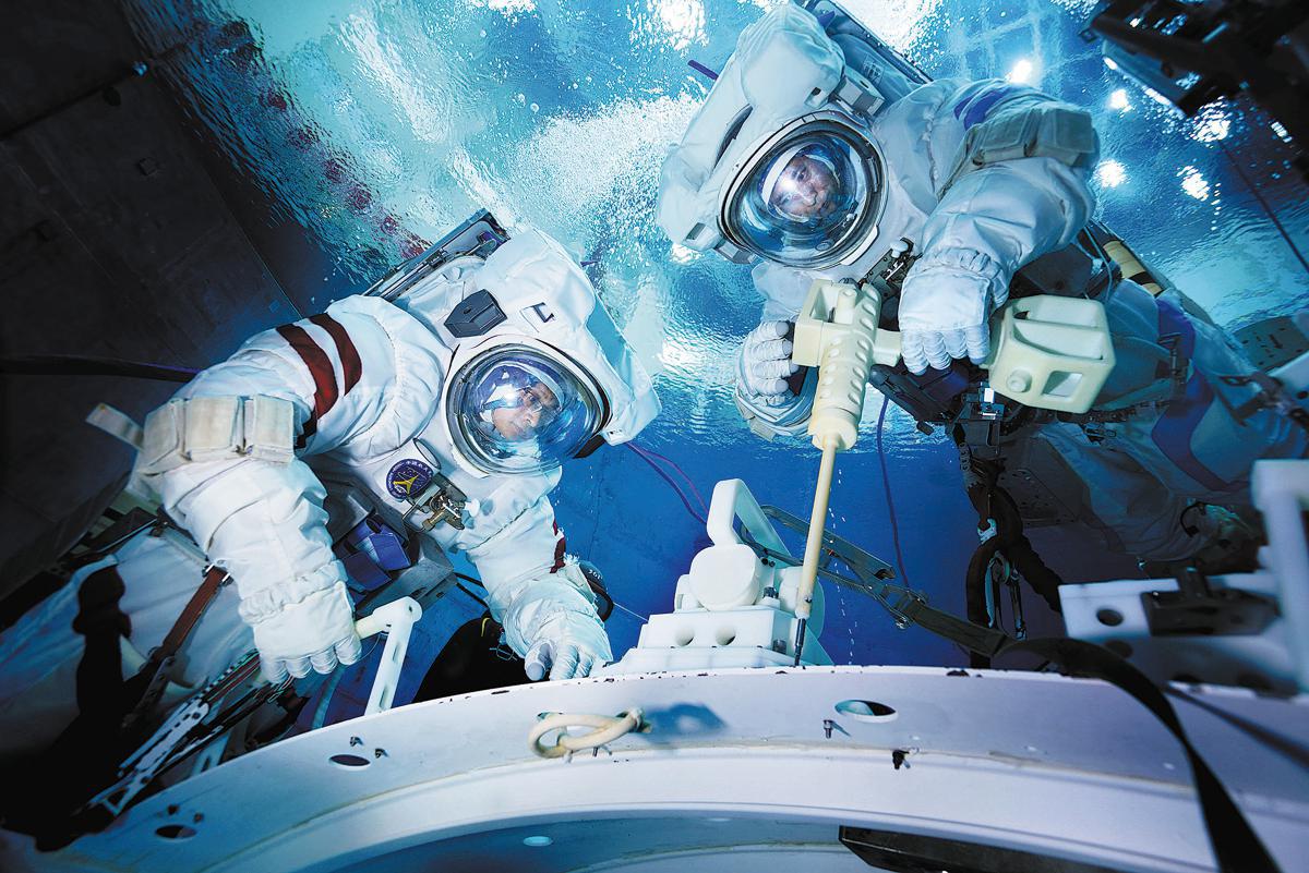 Shenzhou XVI crew members Zhu Yangzhu (right) and Gui Haichao take part in underwater training on March 29. Xu Bu / for China Daily
