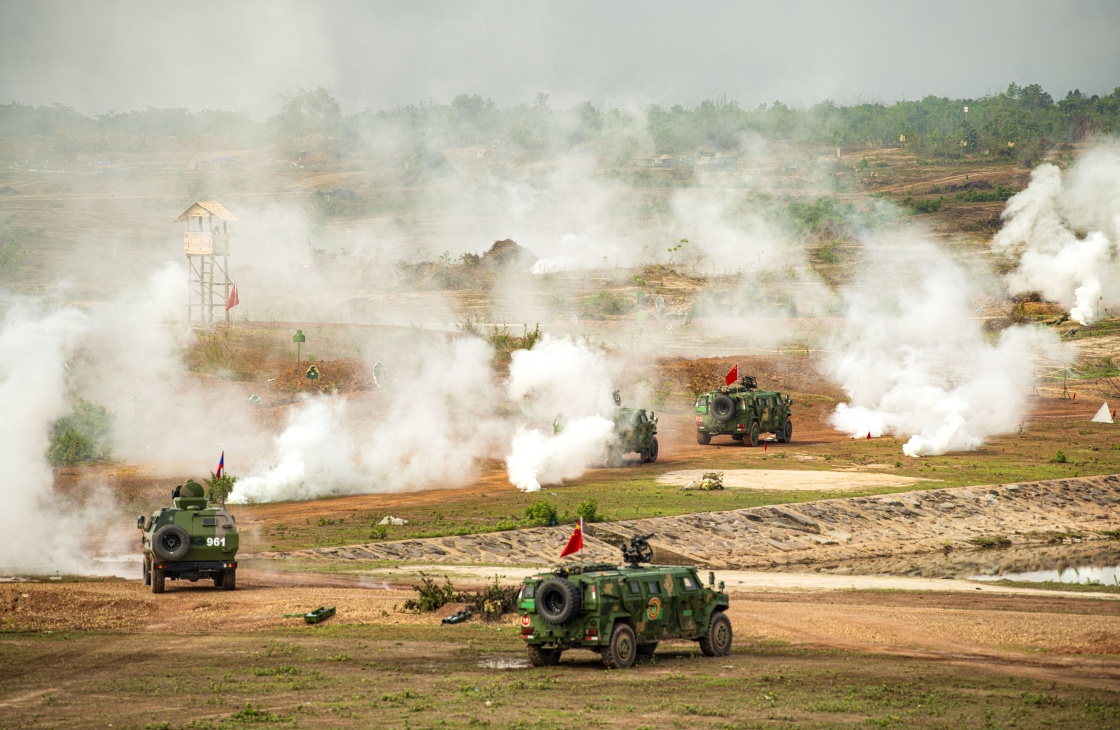 Armored vehicles from both sides maneuver in formation during the China-Laos Friendship Shield-2023 joint military exercise at the training ground of Kommadam Academy of the Lao People's Armed Forces (LPAF) on May 26, 2023. (Xinhua/Yang Jicheng)