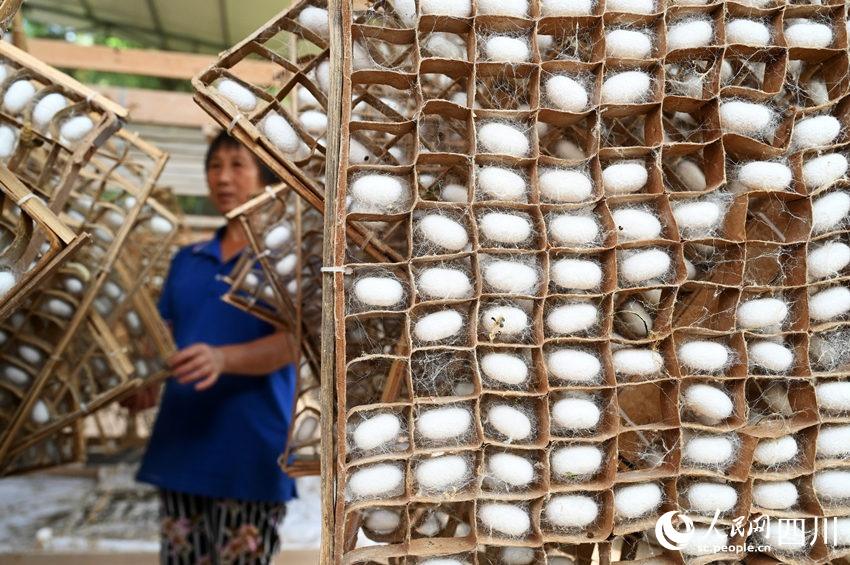 A farmer harvests silkworm cocoons at a sericulture base in Shuangliu village, Dongxing district, Neijiang, southwest China's Sichuan Province. (Photo/Lan Zitao)