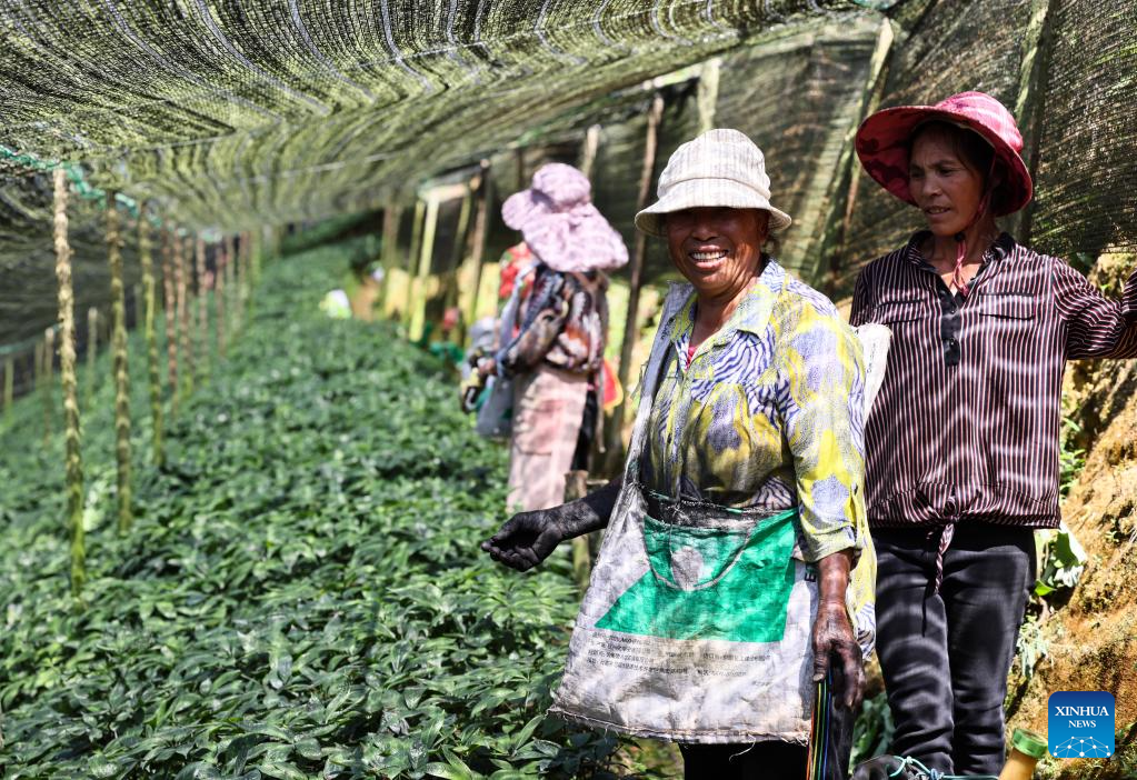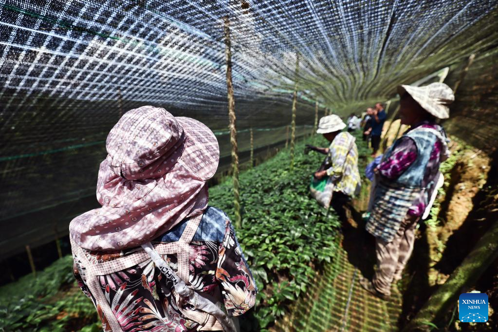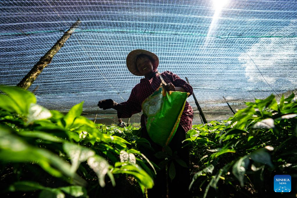 Farmers are pictured at a panax notoginseng cultivation base in Lianhuatang Township of Xichou County, Wenshan Zhuang and Miao Autonomous Prefecture, southwest China's Yunnan Province, May 31, 2023.?(Xinhua/Lan Hongguang)