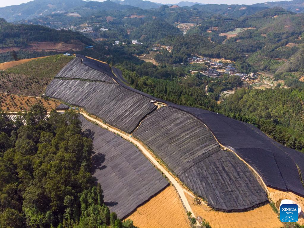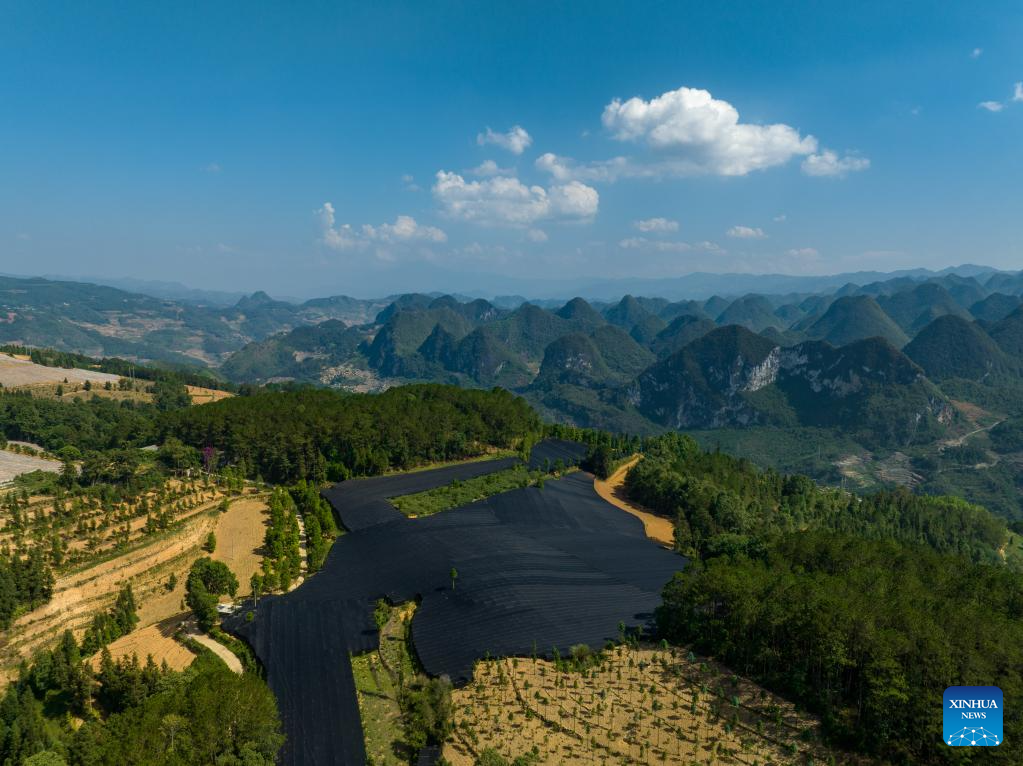 This aerial photo shows a panax notoginseng cultivation base in Lianhuatang Township of Xichou County, Wenshan Zhuang and Miao Autonomous Prefecture, southwest China's Yunnan Province, May 31, 2023.?(Xinhua/Zhou Dixiao)