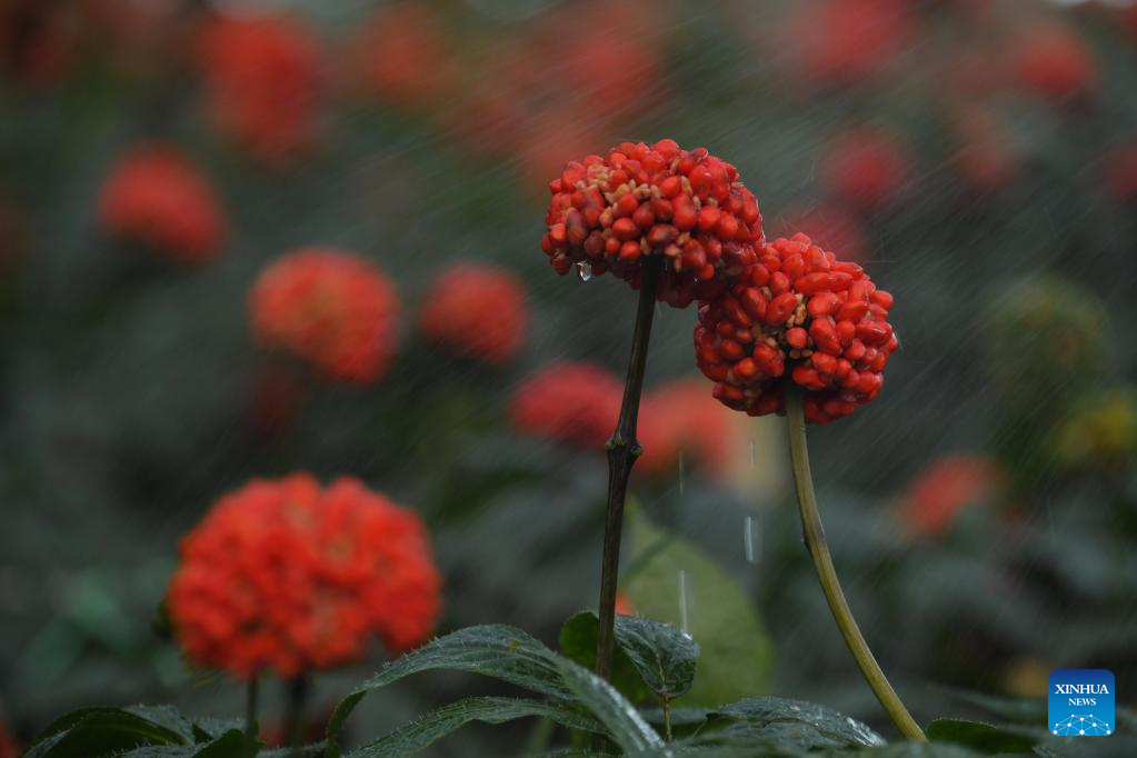 This photo shows panax notoginseng fruits at a panax notoginseng cultivation base in Lianhuatang Town of Xichou County, Wenshan Zhuang and Miao Autonomous Prefecture, southwest China's Yunnan Province, Nov. 5, 2022. (Photo by Chen Mingkai/Xinhua)