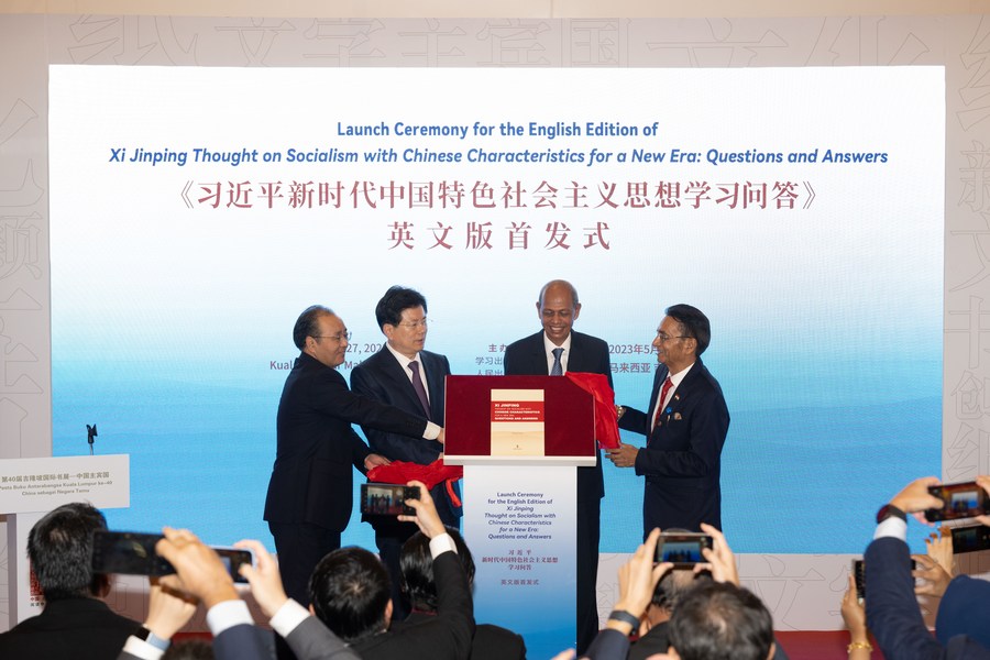 This photo taken on May 27, 2023 shows the launch ceremony for the English edition of "Xi Jinping Thought on Socialism with Chinese Characteristics for a New Era: Questions and Answers" during an event of China as the guest of honor on the 40th Kuala Lumpur International Book Fair in Kuala Lumpur, Malaysia. (Xinhua/Zhu Wei)