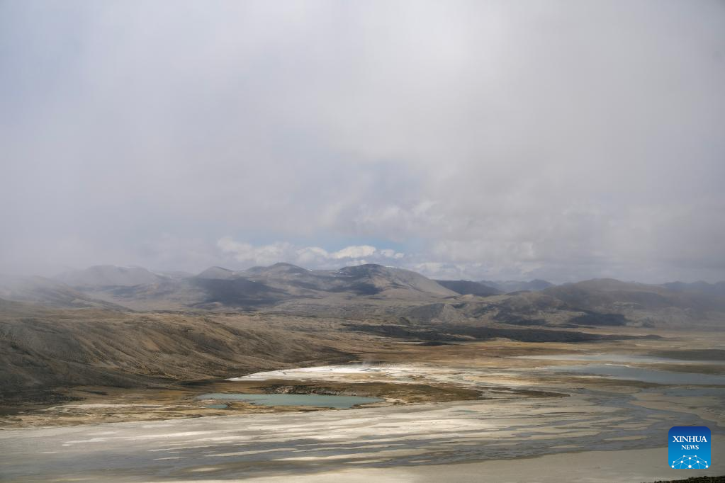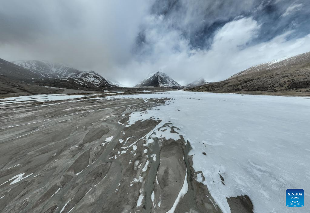 This aerial photo taken on May 31, 2023 shows the river bed at the foot of the Gyaimaryangzhong Glacier in southwest China's Tibet Autonomous Region. The Gyaimaryangzhong Glacier is the source of the Yarlung Zangbo River, China's longest plateau river. (Xinhua/Jigme Dorje)