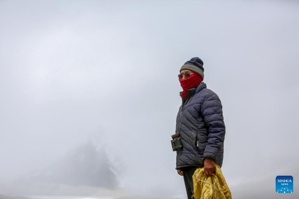 A local herdsman looks at the Gyaimaryangzhong Glacier through binoculars in southwest China's Tibet Autonomous Region, May 31, 2023. The Gyaimaryangzhong Glacier is the source of the Yarlung Zangbo River, China's longest plateau river. (Xinhua/Jigme Dorje)