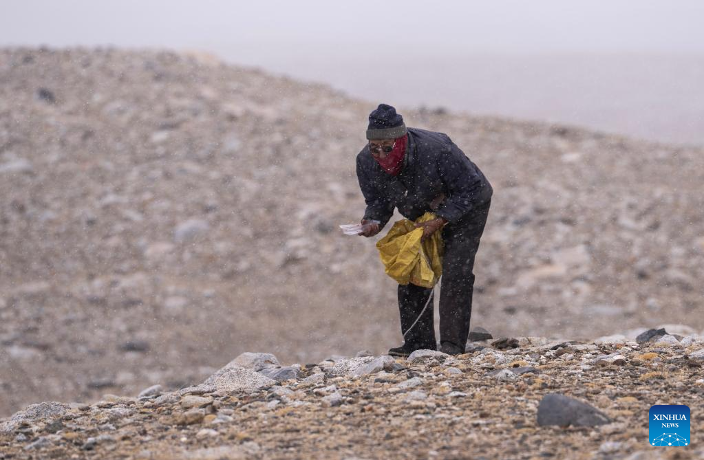 A local herdsman collects trash near the Gyaimaryangzhong Glacier in southwest China's Tibet Autonomous Region, May 31, 2023. The Gyaimaryangzhong Glacier is the source of the Yarlung Zangbo River, China's longest plateau river. (Xinhua/Fei Maohua)