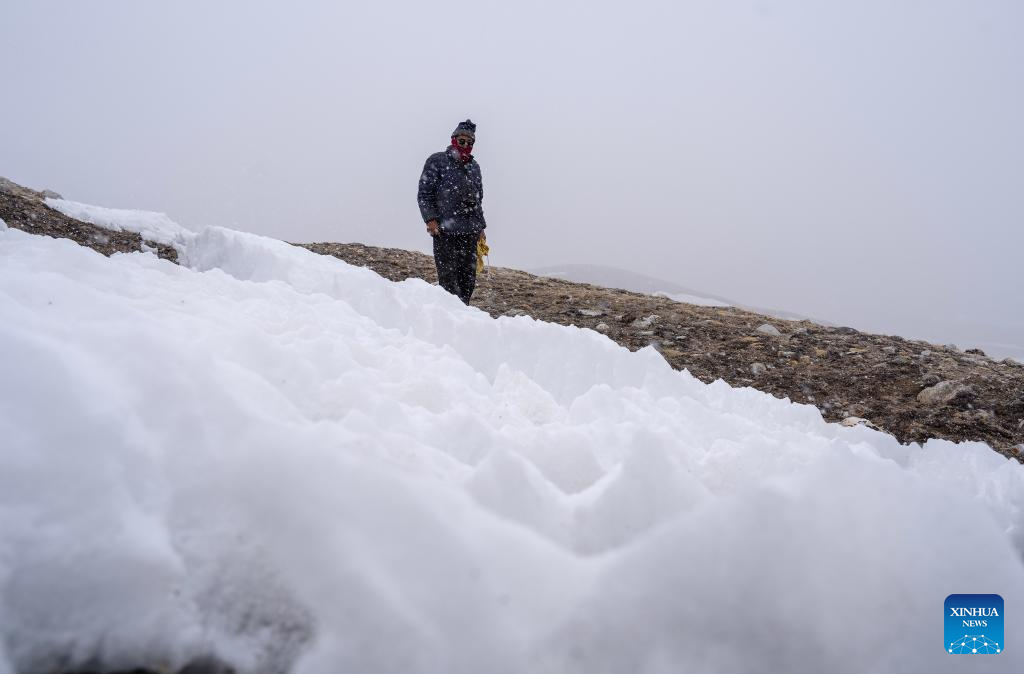 A local herdsman collects trash near the Gyaimaryangzhong Glacier in southwest China's Tibet Autonomous Region, May 31, 2023. The Gyaimaryangzhong Glacier is the source of the Yarlung Zangbo River, China's longest plateau river. (Xinhua/Shao Zedong)