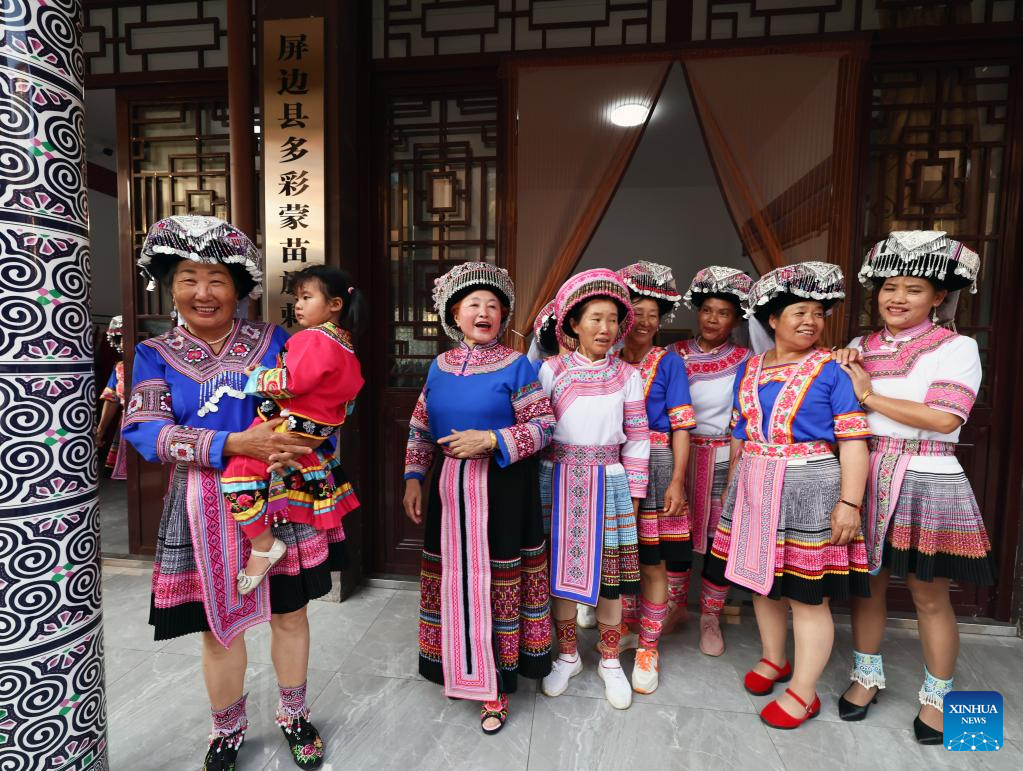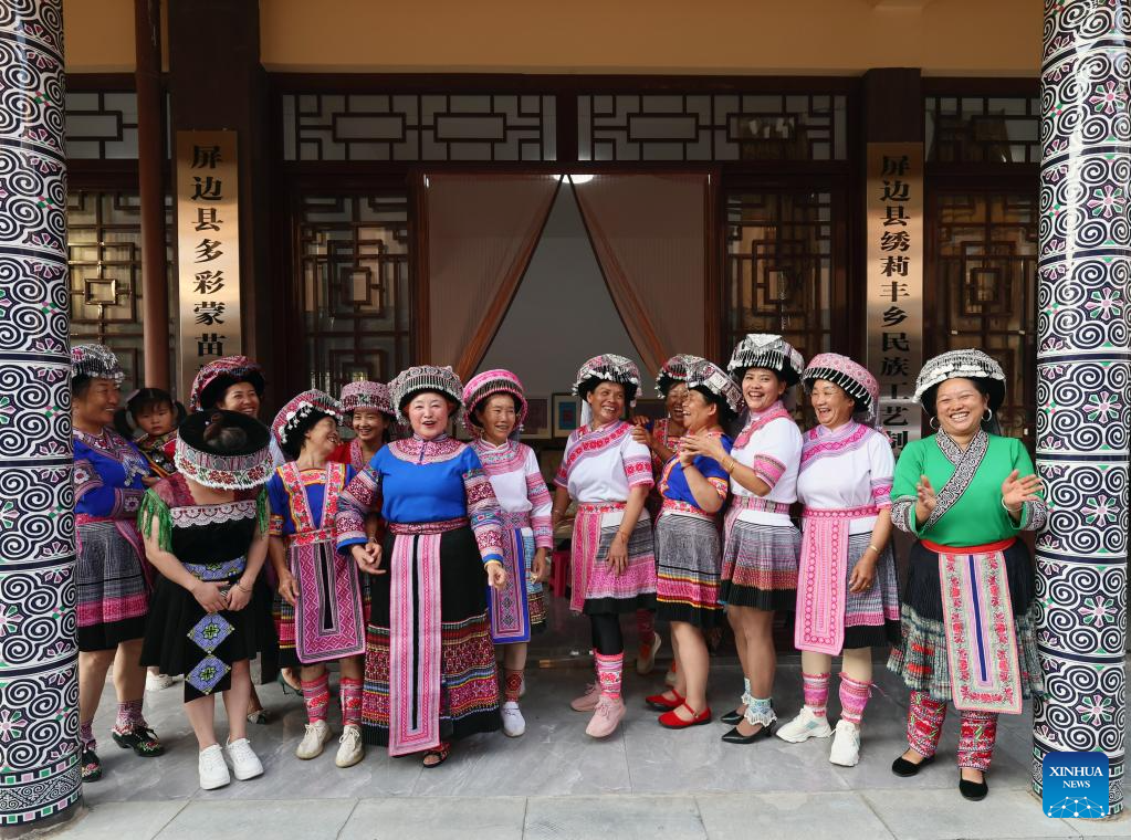 Women of Miao ethnic group pose for a group photo at an embroidery workshop in Pingbian Miao Autonomous County, southwest China's Yunnan Province, June 1, 2023. Pingbian Miao Autonomous County has been making efforts to support and develop its embroidery industry, trying to provide job opportunities to local women. (Xinhua/Lan Hongguang)