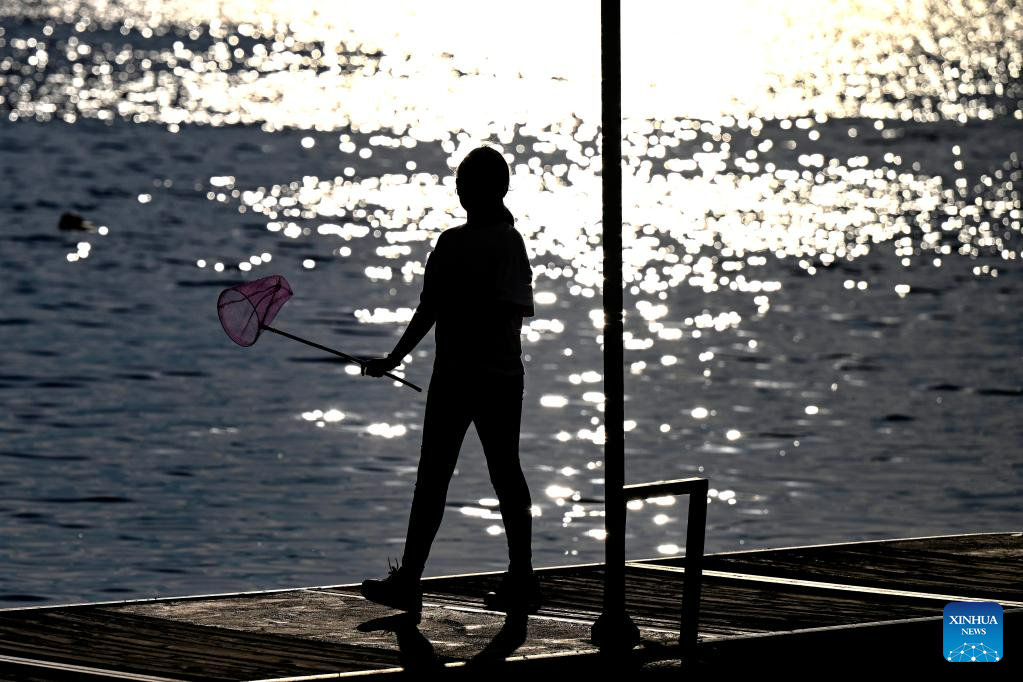 People are silhouetted against sunset at the dock of Ohrid Lake in Ohrid, North Macedonia, on June 2, 2023. (Photo by Tomislav Georgiev/Xinhua)