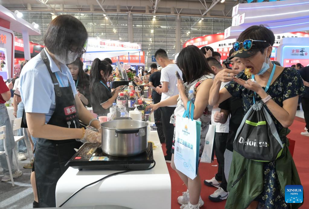 Visitors taste seafood during the 2023 China (Fuzhou) International Seafood &Fisheries Expo in Fuzhou, capital of southeast China's Fujian Province, June 2, 2023. Hundreds of enterprises from both home and abroad participated in the expo, which opened here on Friday. (Xinhua/Lin Shanchuan)