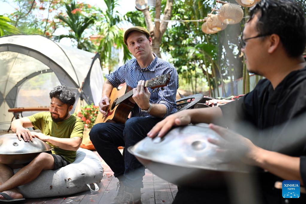 French photographer Jeremy Grinan (C) plays guitar with his friends in the yard of his workshop in Chengmai County in south China's Hainan Province, May 17, 2023. (Xinhua/Guo Cheng)