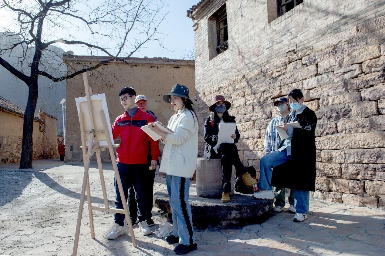 Teachers and students from Jinzhong University join an outdoor sketching activity in Zuoquan county, north China's Shanxi province, March 13, 2023. (People's Daily Online/Xing Lanfu)
